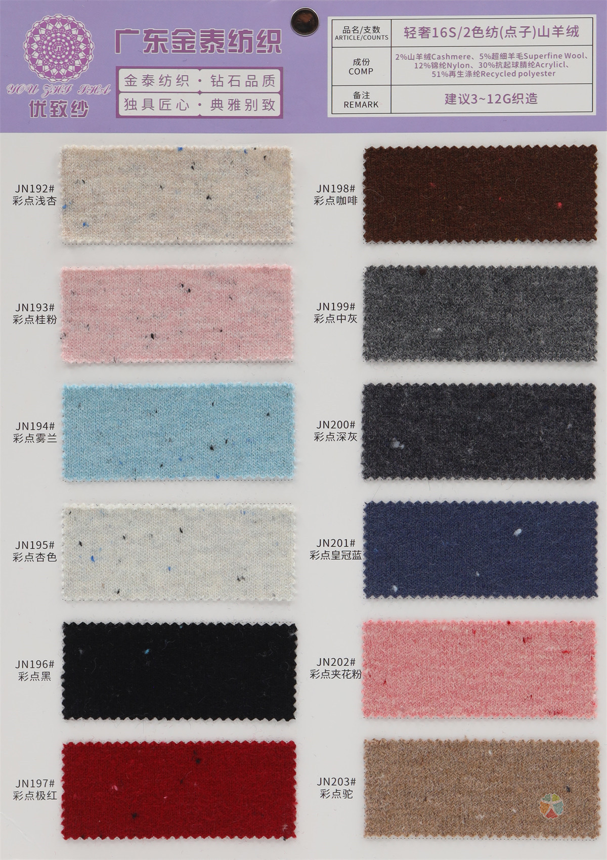 2%山羊绒5%超细羊毛12%锦纶30%抗起球腈纶51%再生涤纶